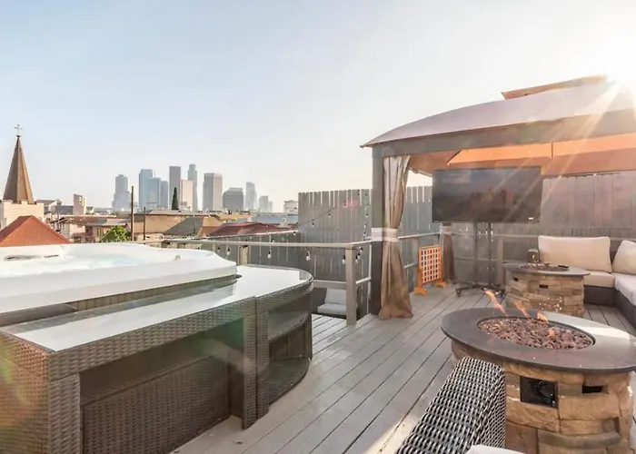 Villa Gorgeous Dtla W/ View + Hot Tub!, situé à 17 minutes de marche du Musée d'art contemporain The Broad, invite ses clients à se détendre dans un jacuzzi. Proposant du Wi-Fi, la villa se trouve relativement près de Civic Center/Grand Park.